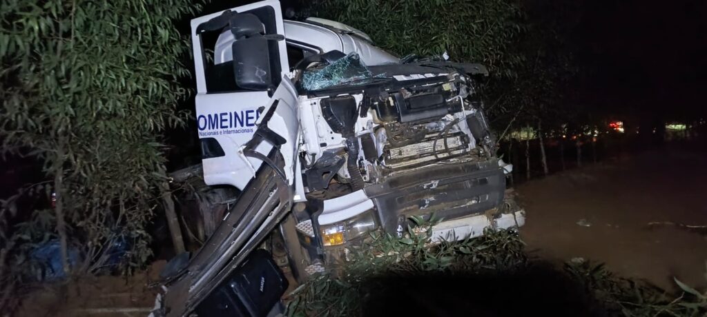 Com o impacto, o caminhão saiu da pista e atingiu uma árvore de eucalipto além do acostamento.