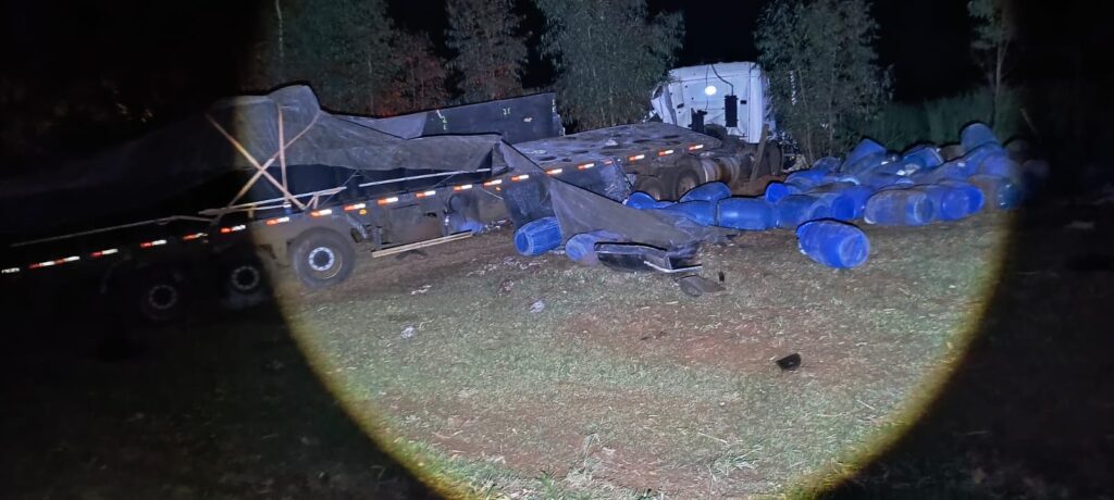 Parte da carga transportada pela carreta caiu solo devido a colisão