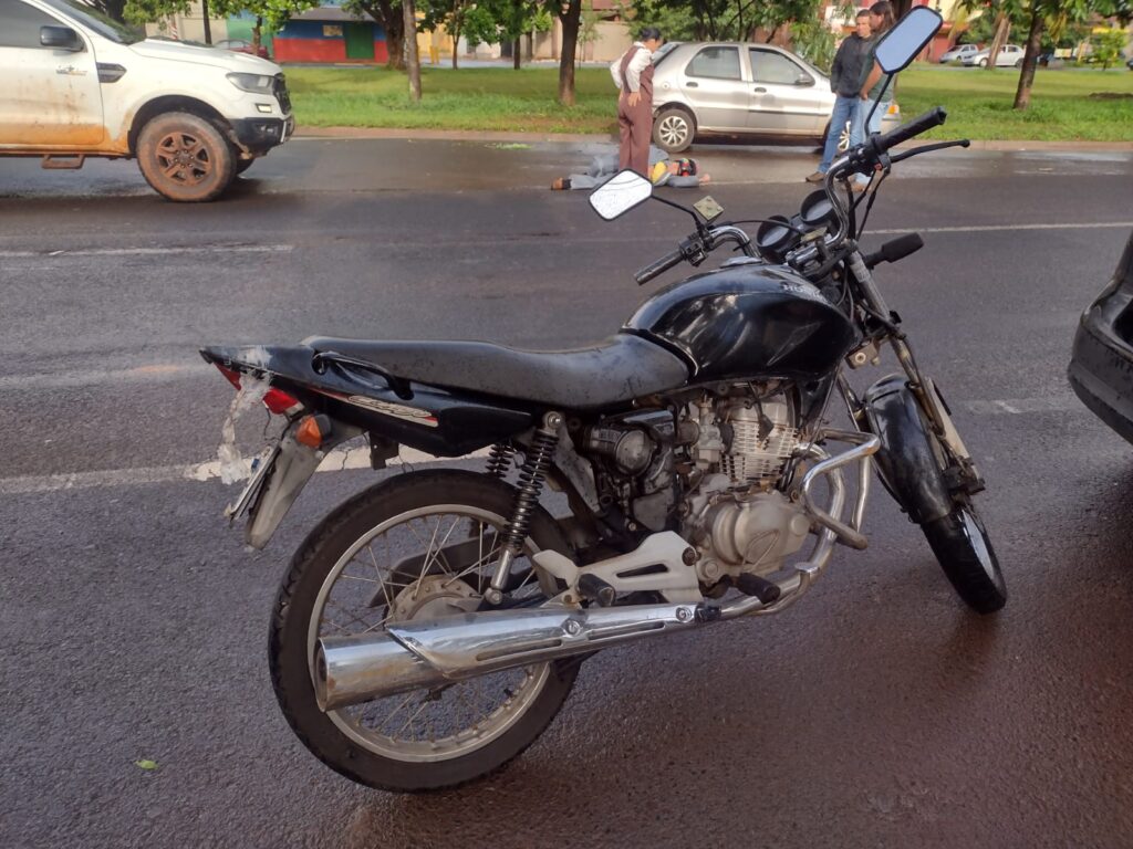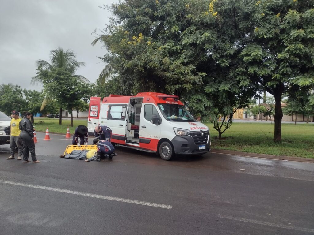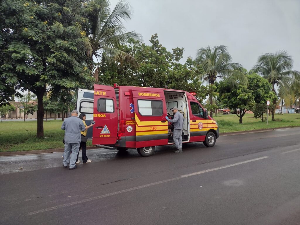 A condutora da moto com provável fratura no tornozelo esquerdo foi socorrida pelo SAMU através da médica Fernanda, enfermeiro Mateus e socorrista Geneci sendo encaminhada para clínica médica da Santa Casa.