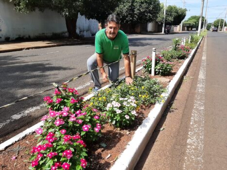 O barretense Valdemir Lisboa ao lado das flores na avenida Foto – Roberto José