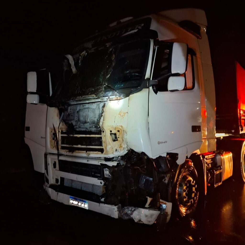 Com o impacto a moto pegou fogo, incendiando também a cabine do caminhão.