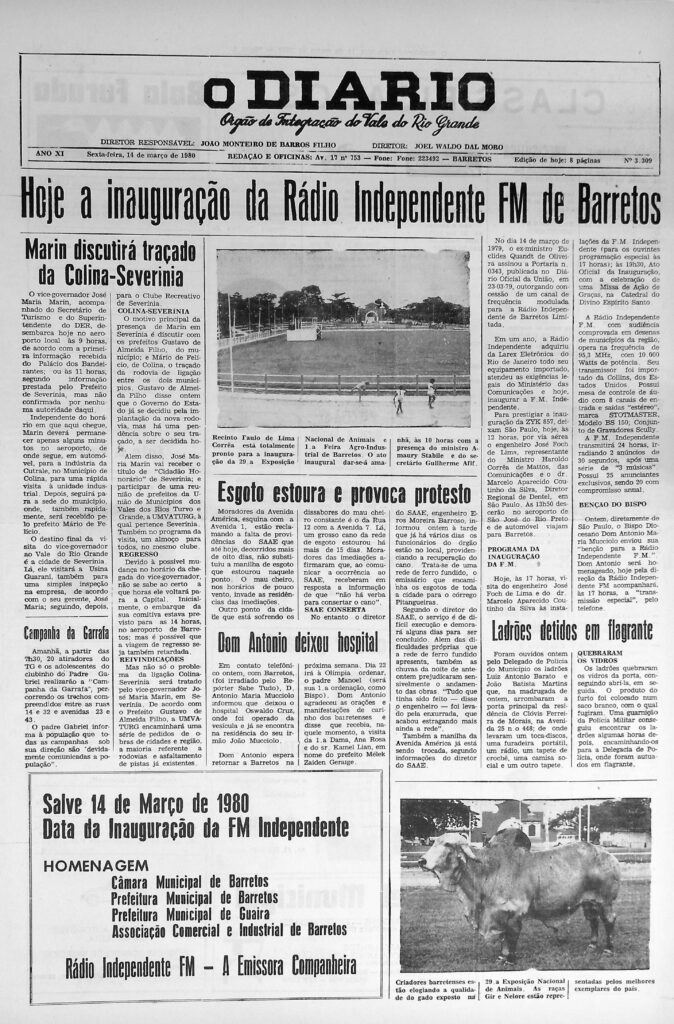Capa de O Diário, de 14 de março de 1980, traz reportagem sobre a inauguração da Rádio Independente FM