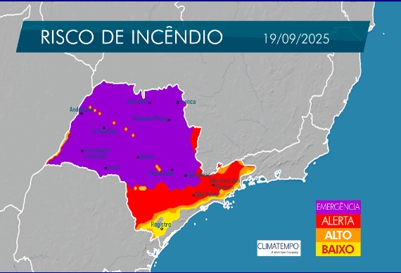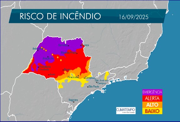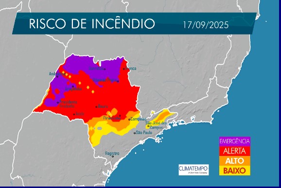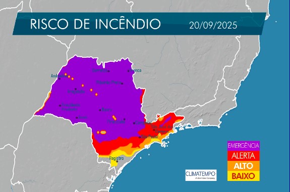 A Defesa Civil de São Paulo emitiu alerta de risco extremo para queimadas em todo o estado, com destaque para a região de Barretos, que permanece sob atenção até sábado (20). Segundo o Comitê de Gerenciamento da Operação SP Sem Fogo, os mapas de risco mostram grande parte do território em vermelho e roxo, indicando emergência, por causa das altas temperaturas e baixa umidade do ar.