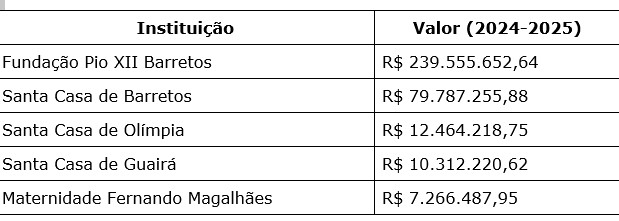 Em Barretos, a Fundação Pio XII (Hospital de Amor) recebeu R$ 239.555.652,64. Já a Santa Casa de Barretos somou R$ 79.787.255,88. Juntas, as duas instituições receberam R$ 319.342.908,52.
